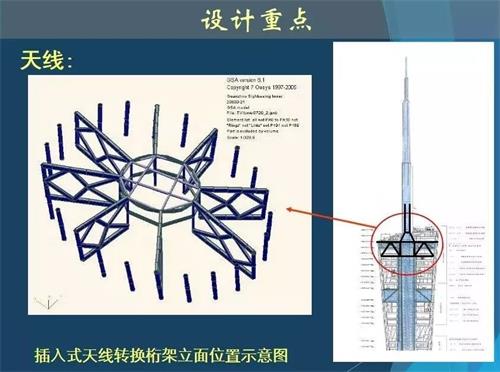 另外,由于廣州新電視塔處于飛機轉向區,按照規定,該處飛機在航線所處位置周圍300米內不能出現障礙物,新電視塔上方飛機飛行高度為海拔900米,因此,為確保飛機飛行安全,也對塔頂天線做了細部處理,現已從塔頂天線撤出10米,最終高度為600米。